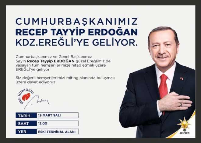Cumhurbaşkanı Recep Tayyip Erdoğan, Kdz. Ereğli ilçesinde 19 Mart 2019 günü saat 12.00'de eski terminal alanında vatandaşlarla buluşacak.